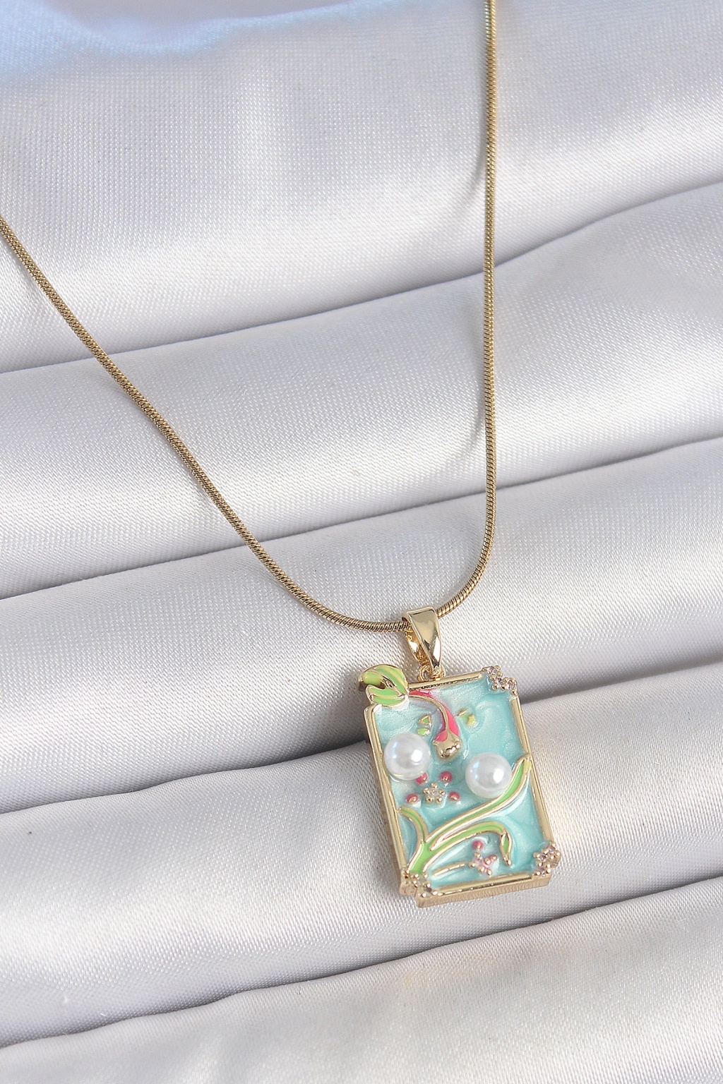 316L Çelik Gold Renk Zincir Mavi Mineli İncili Çiçek İşlemeli Portre Model Kadın Kolye - TJ-BKO10191