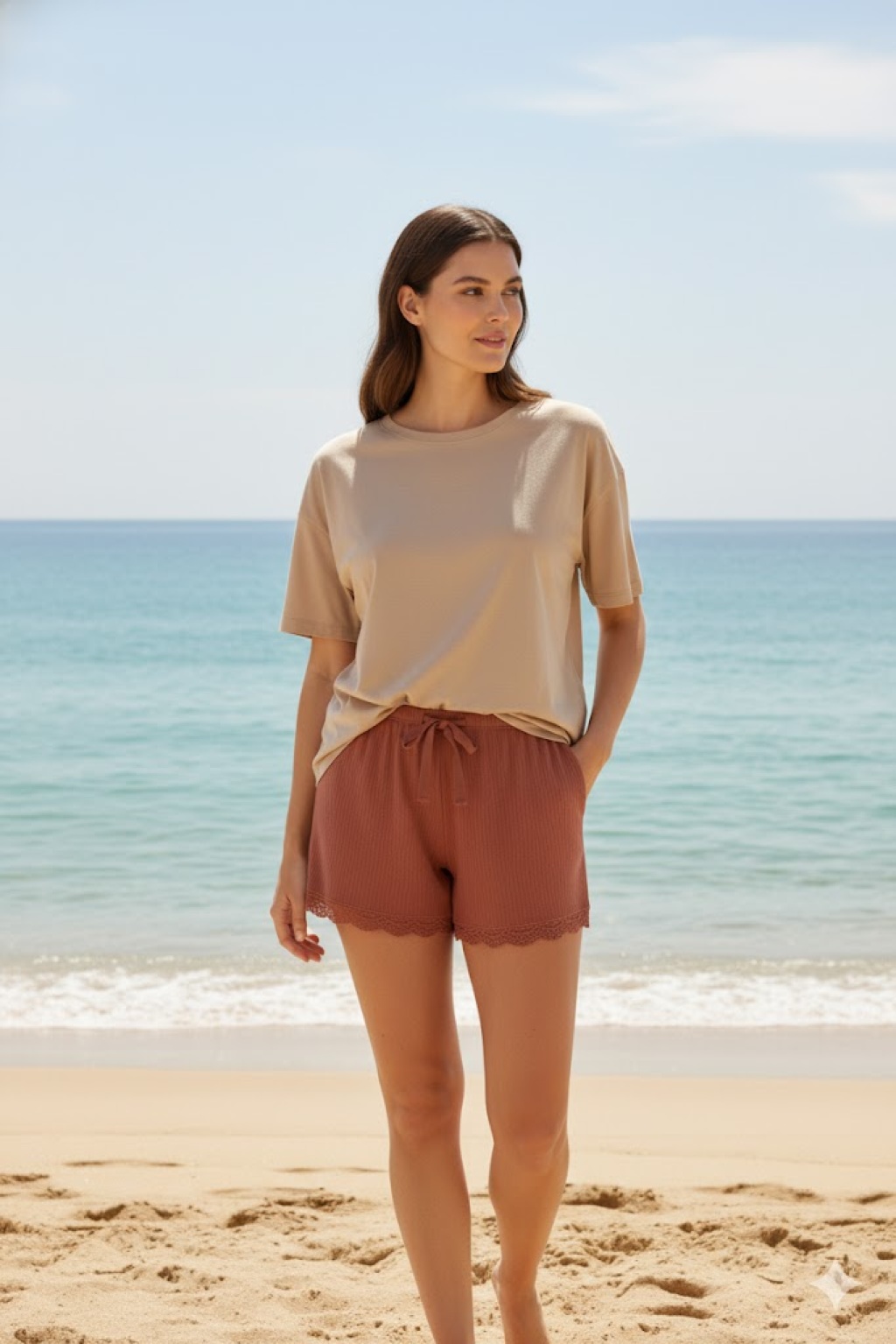 Bambu Fitilli Kadın Ev Şortu Bacak Dantel Detaylı Ev Giyim Taba
