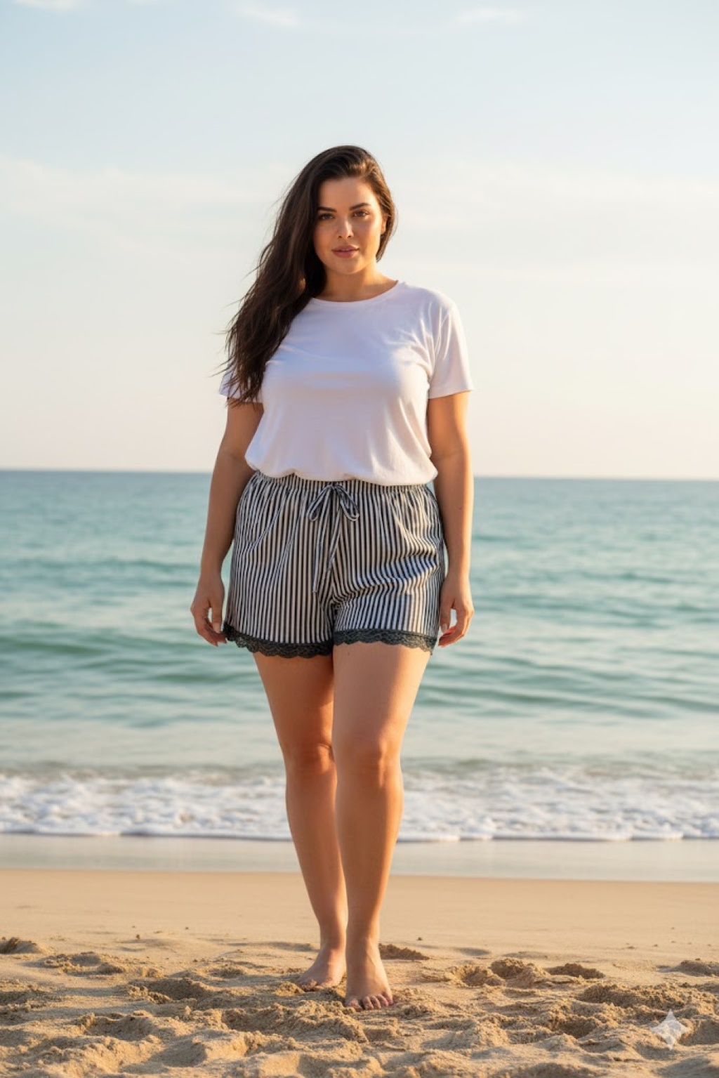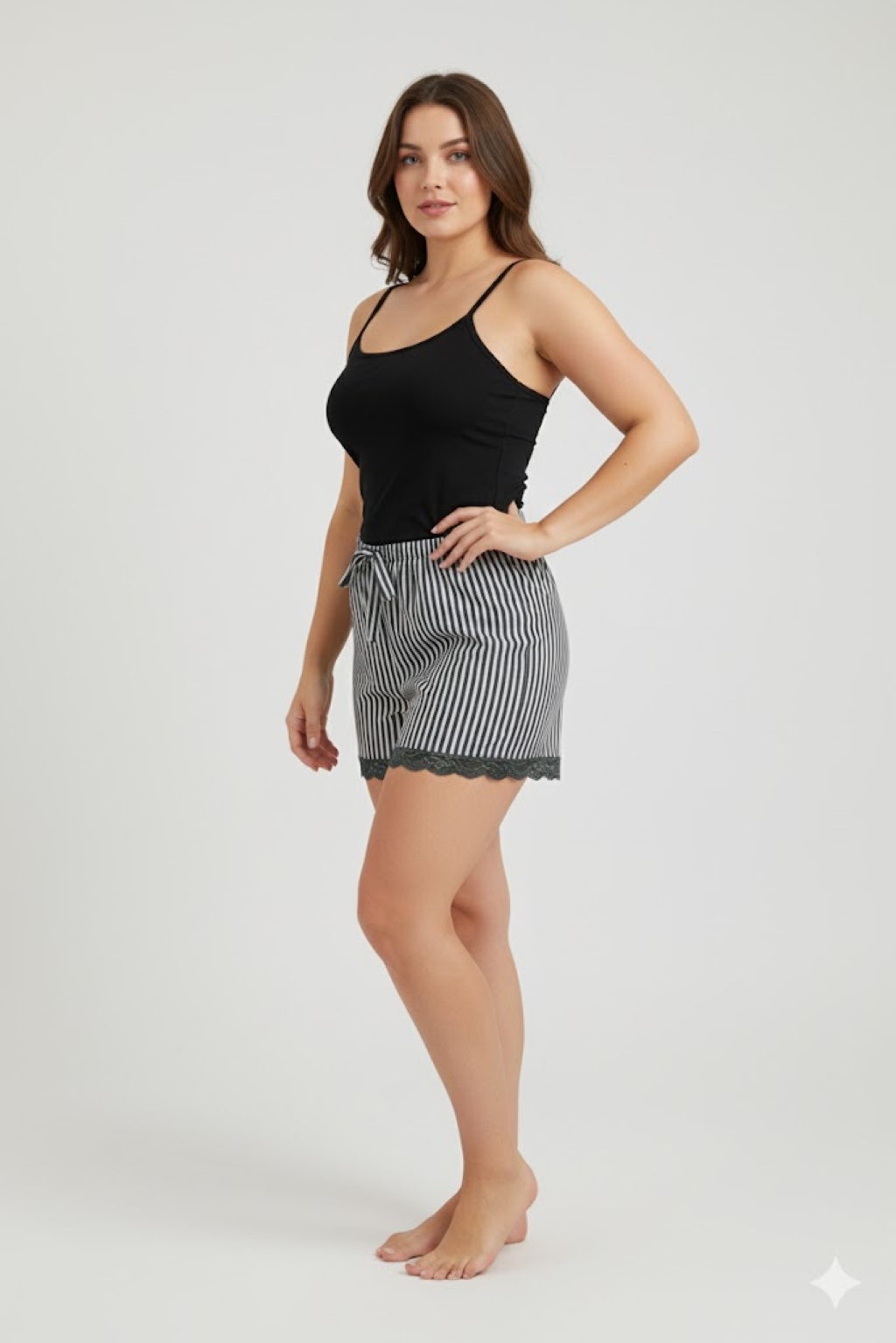 Çizgili Penye Kadın Ev Şortu Bacak Dantel Detaylı Ev Giyim Siyah