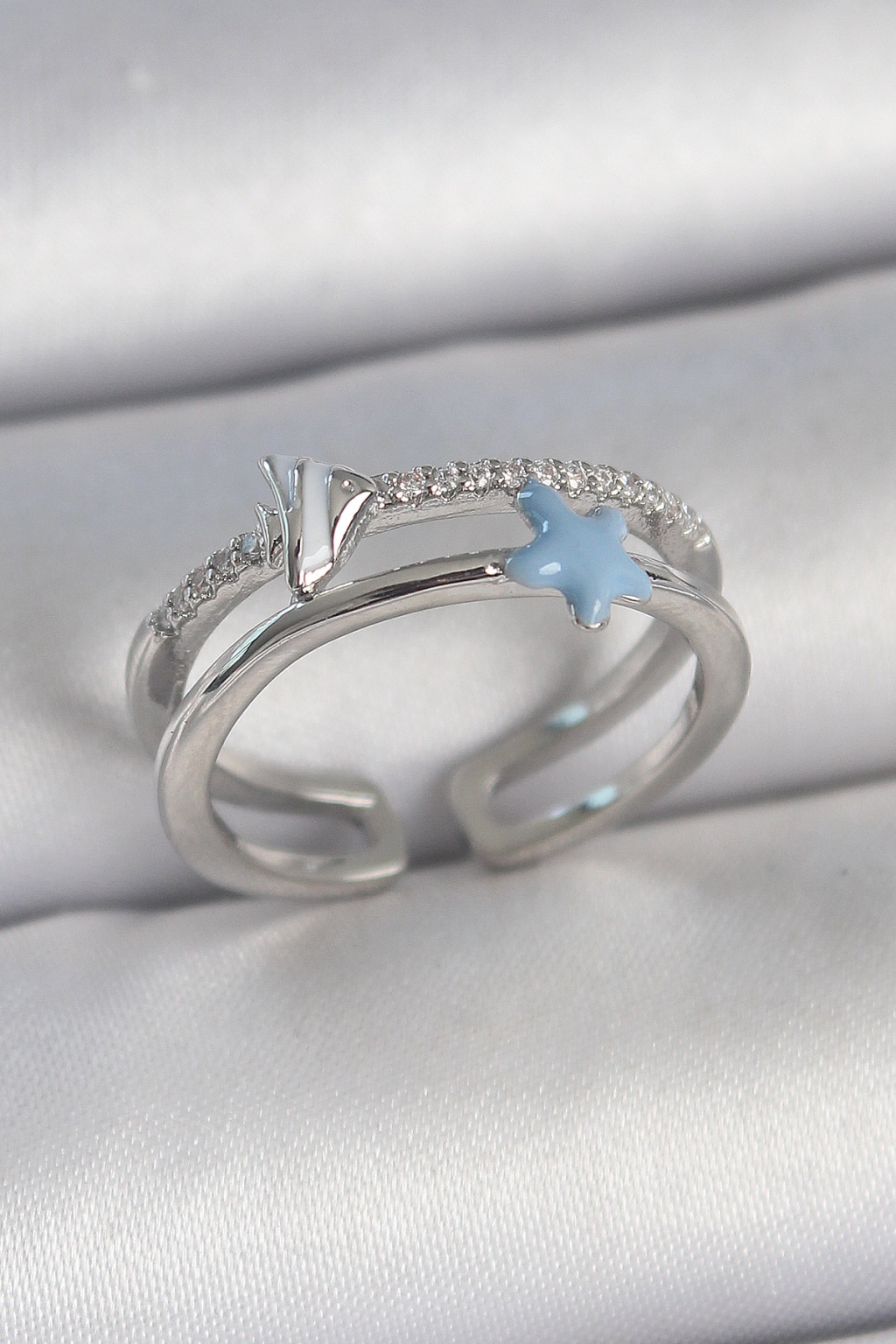 Pirinç Gümüş Renk 2'Li Zirkon Taşlı Mavi Yıldız Figür Ayarlanabilir Kadın Yüzük - TJ-BYK3738