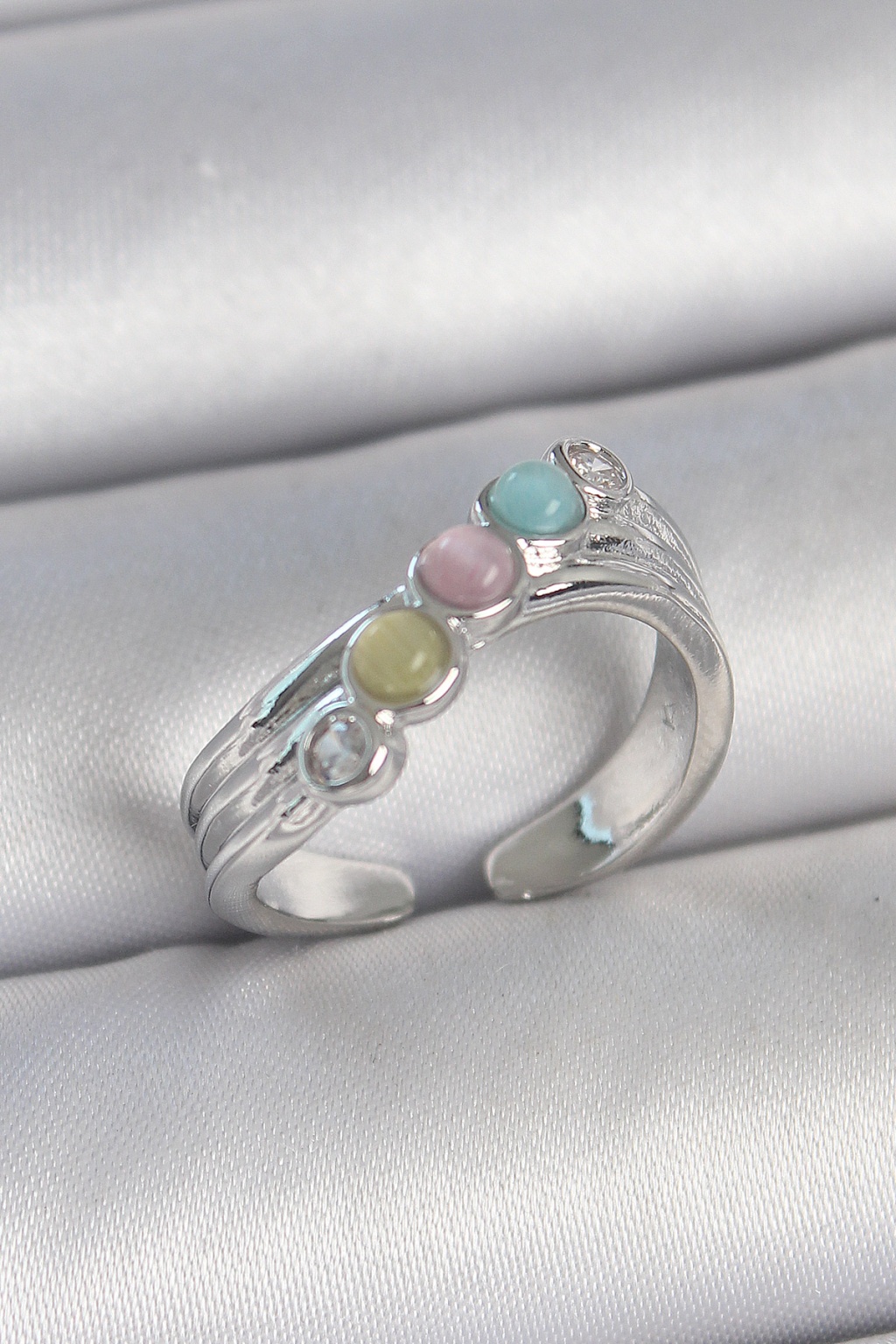 Pirinç Gümüş Renk Zirkon Taş Detaylı Renkli Mineli Ayarlanabilir Kadın Yüzük - TJ-BYK3728